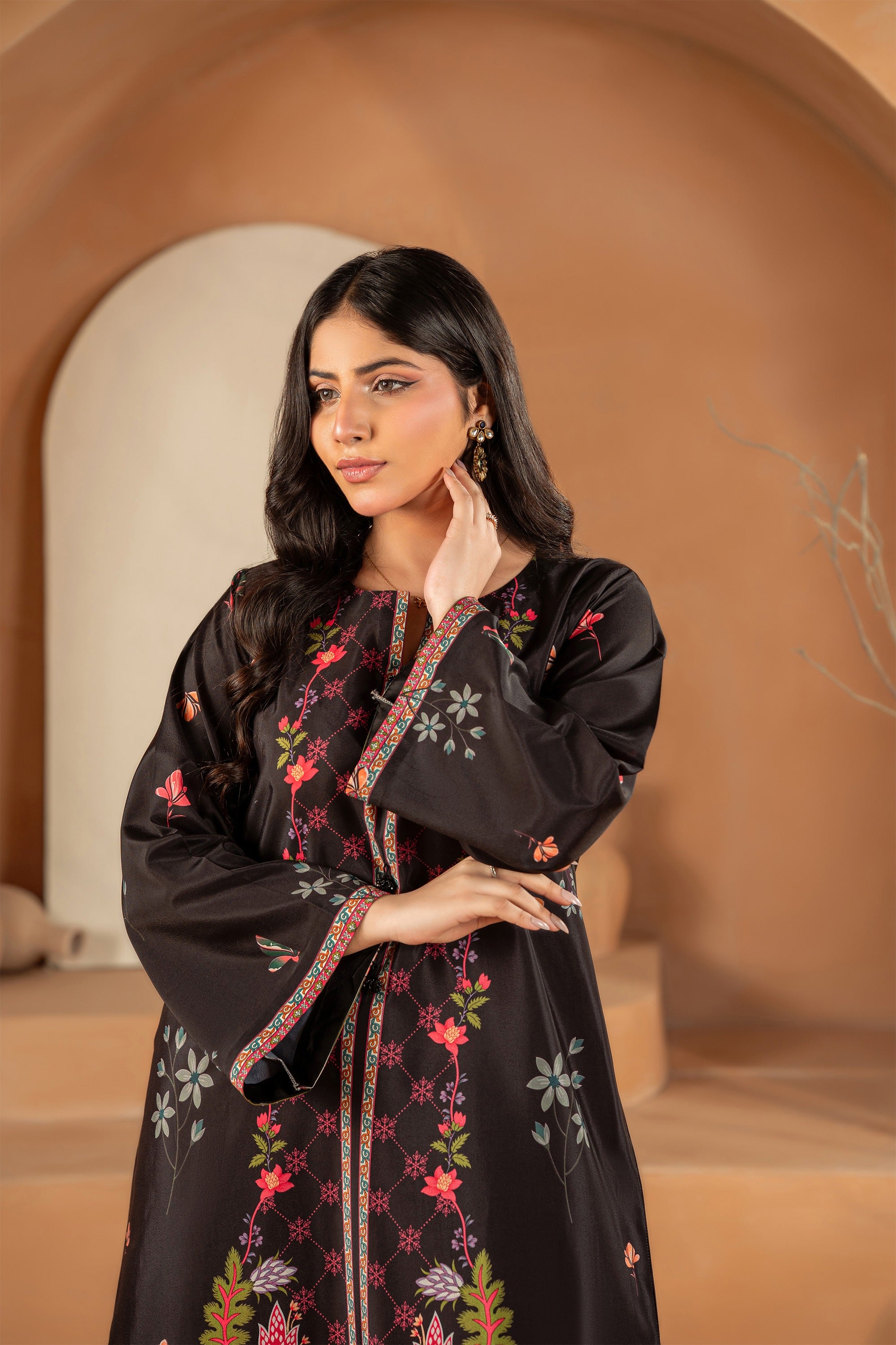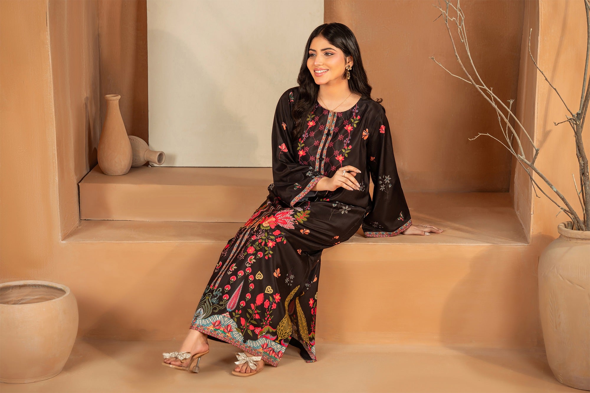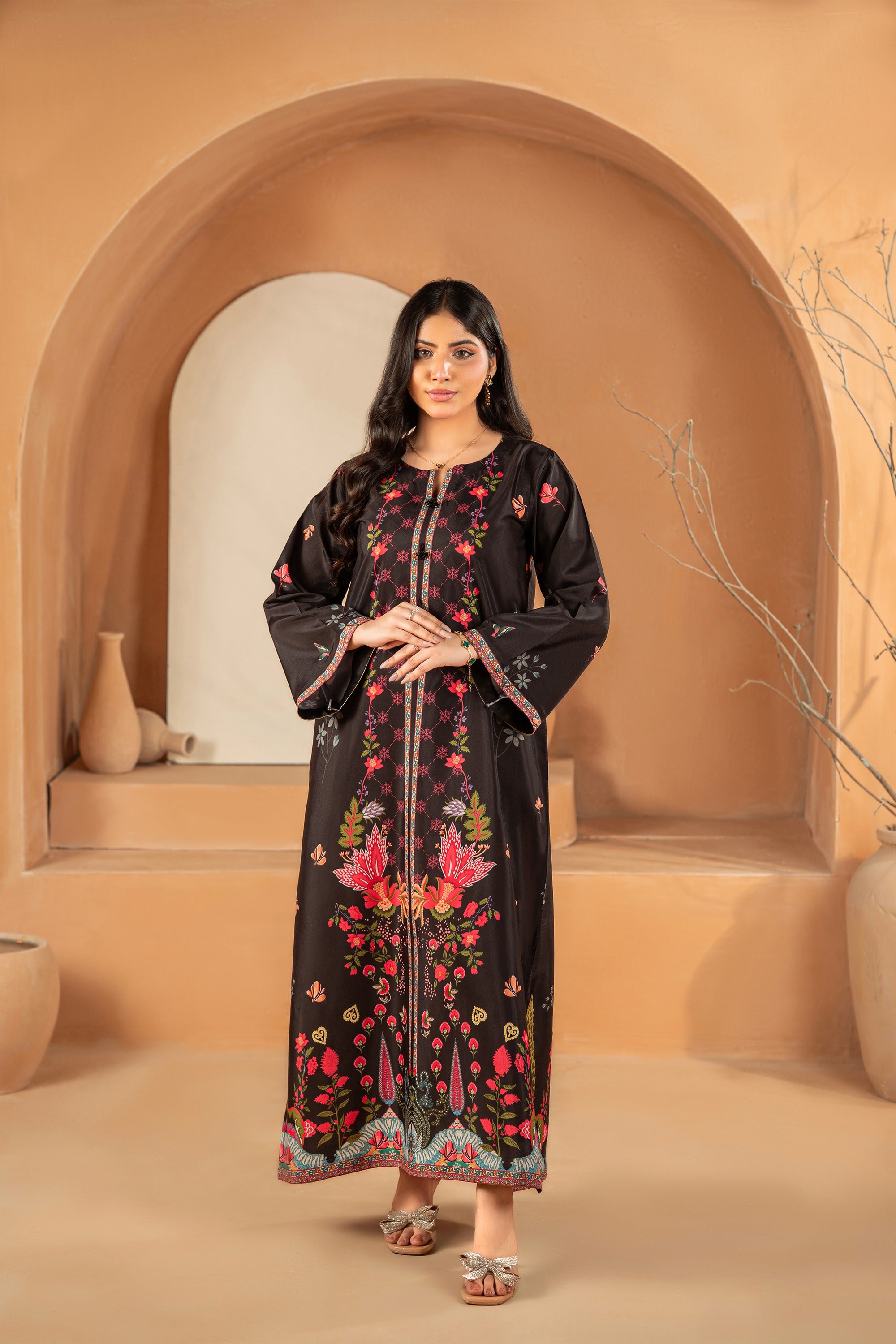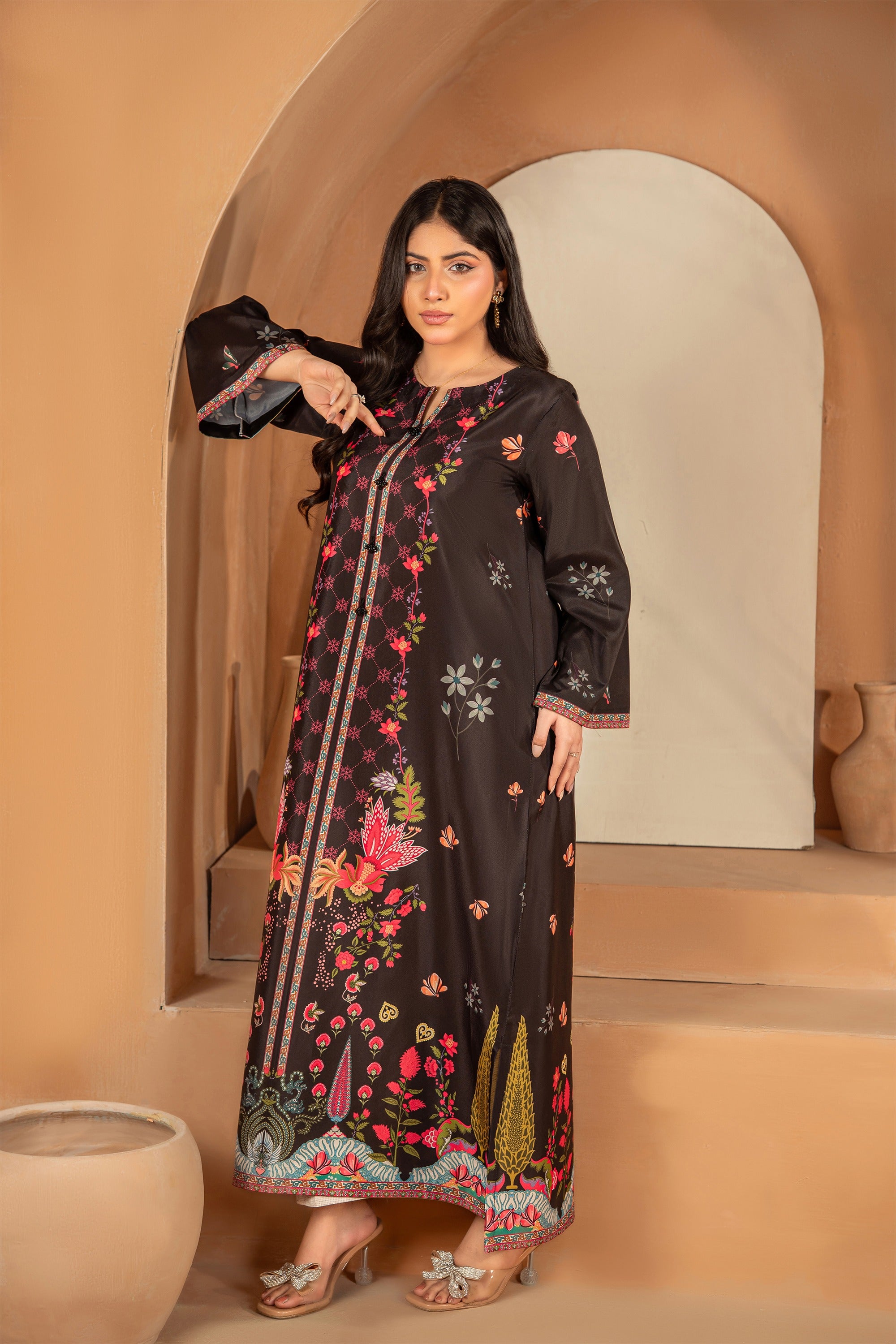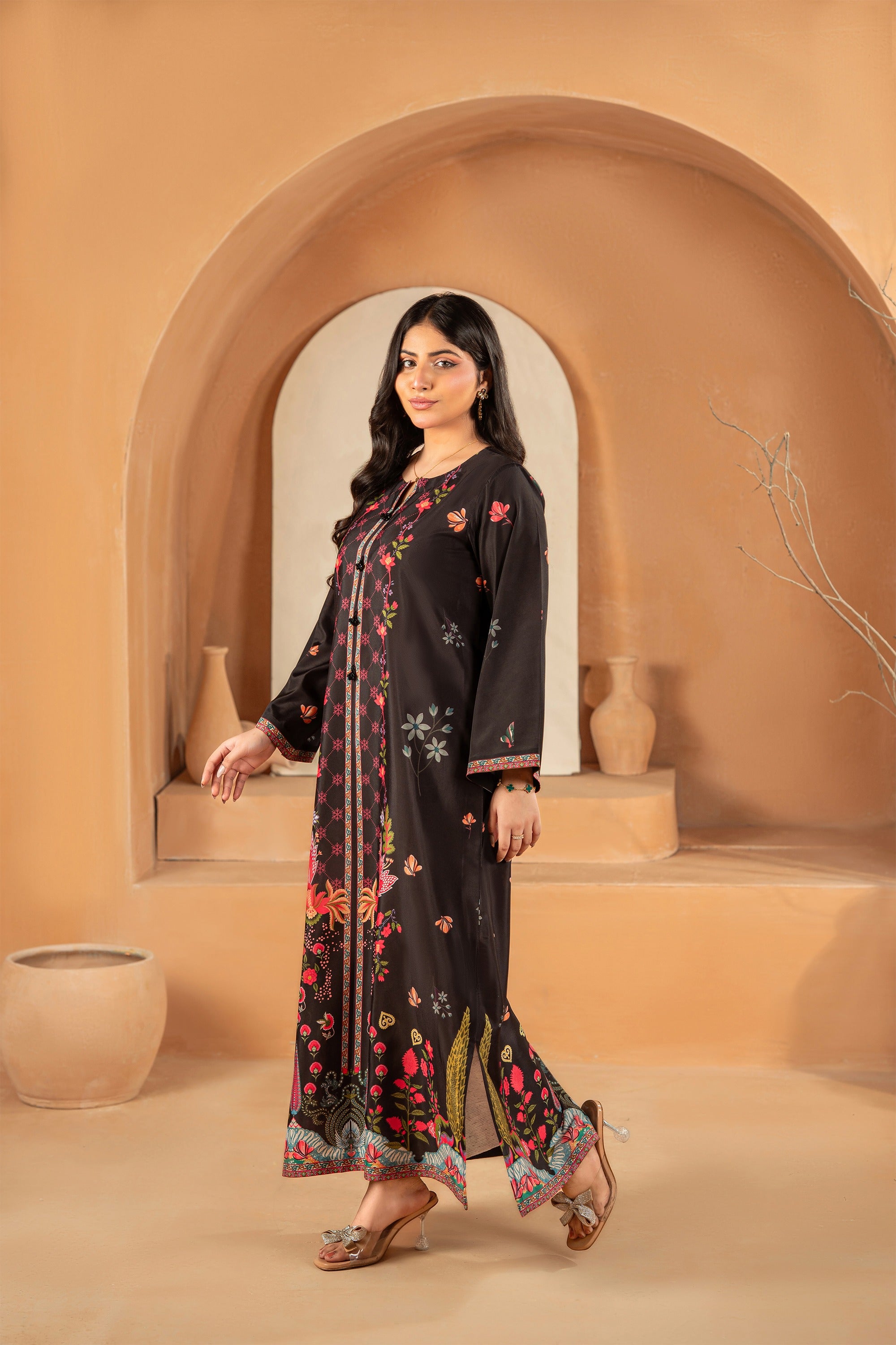 Turn heads in this stunning maxi dress, blending timeless elegance with bold, modern floral artistry. The deep black base beautifully enhances the vibrant, embroidery-inspired print, making it a perfect choice for evening functions, festive celebrations, and refined social gatherings.