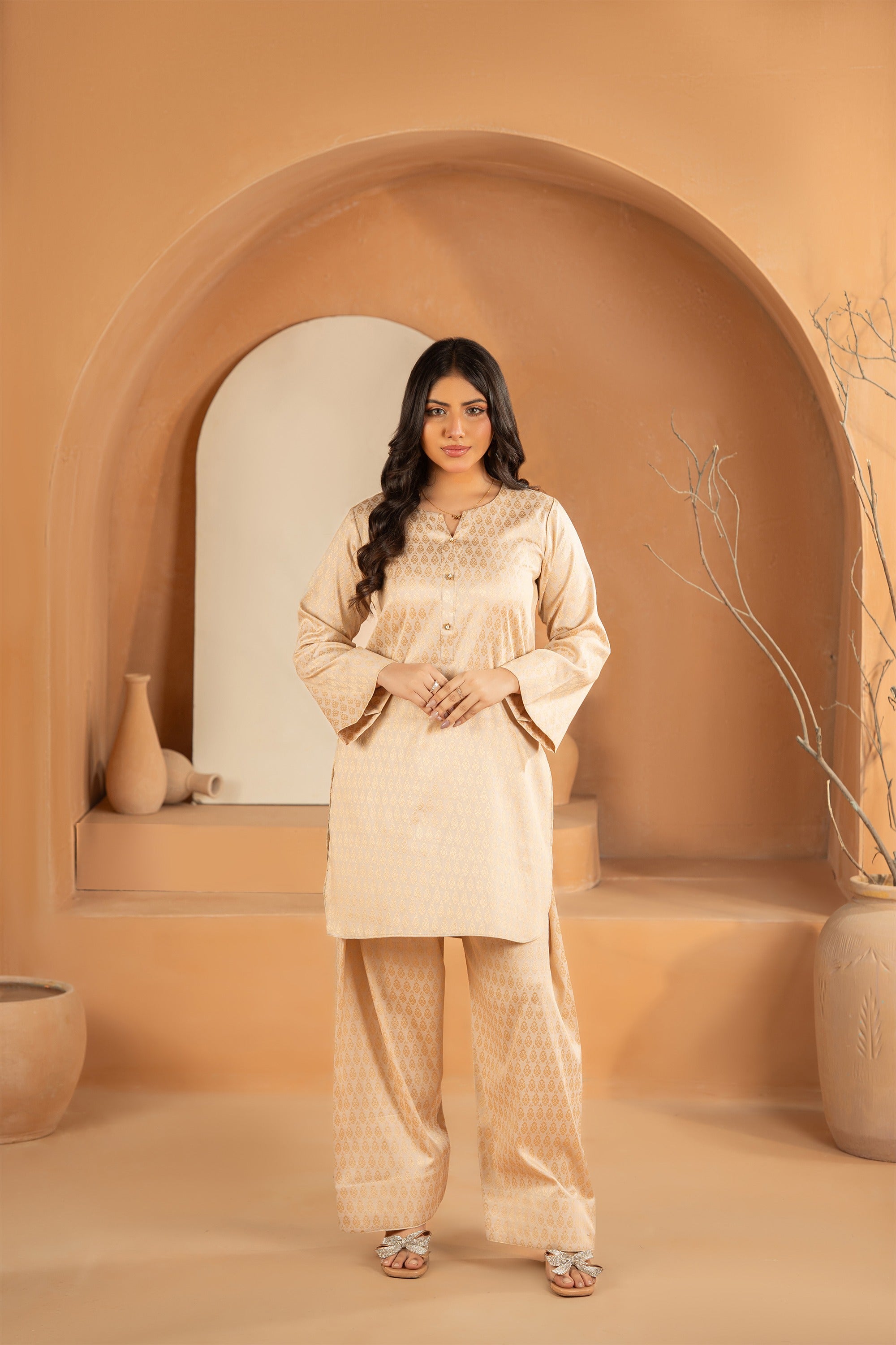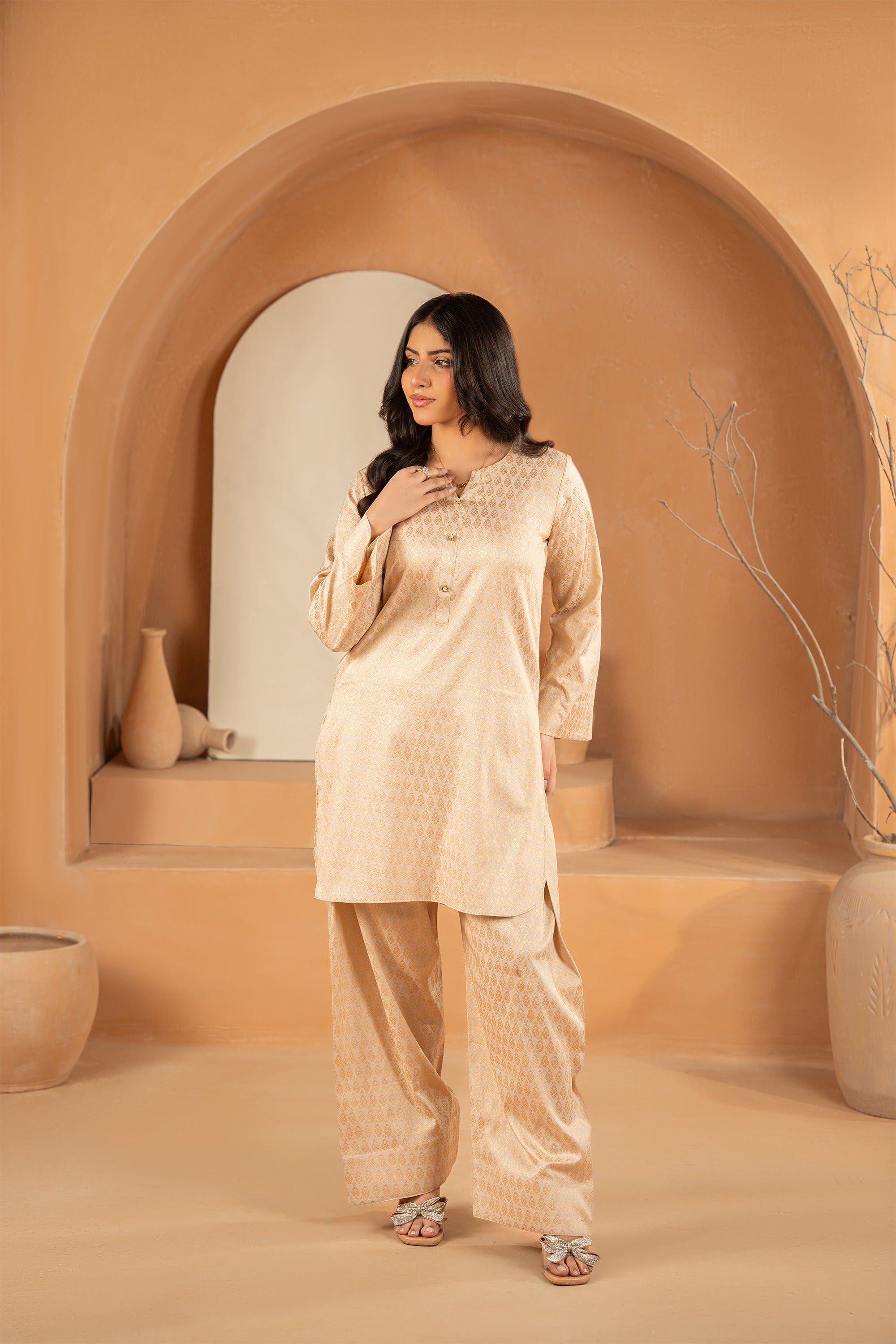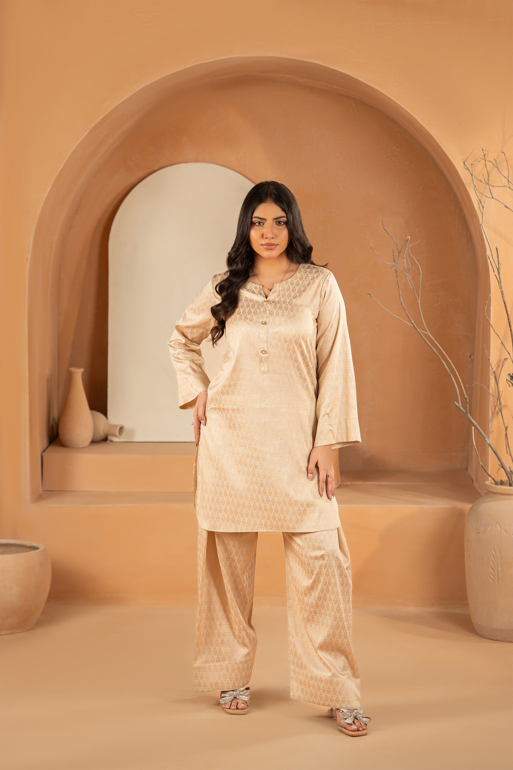 Refresh your wardrobe with this striking co-ord set. Featuring a luxurious, tone-on-tone geometric print that suggests a subtle brocade or jacquard weave, this suit combines a vibrant hue with a refined, traditional pattern, making it perfect for festive daytime wear or special occasions.