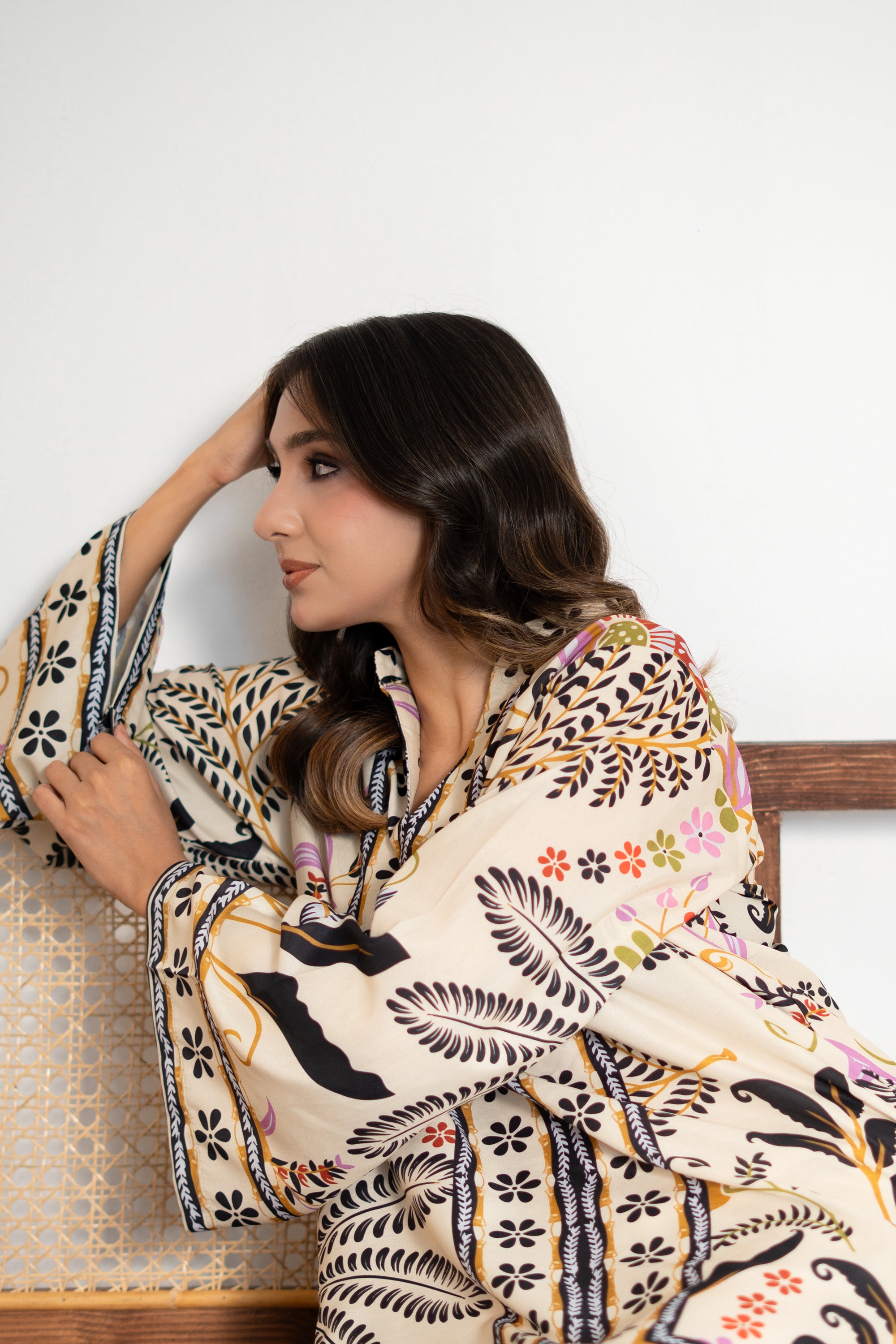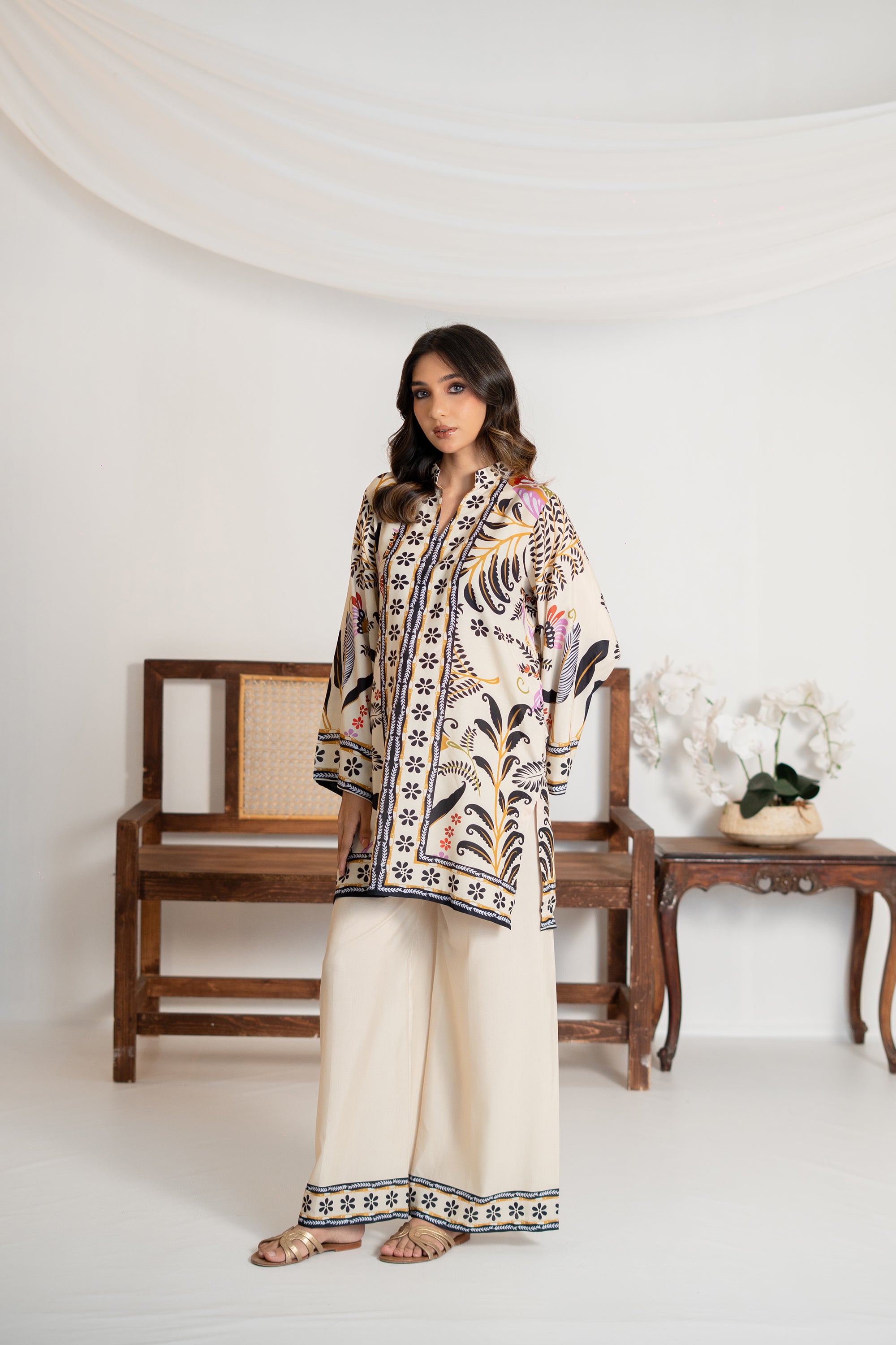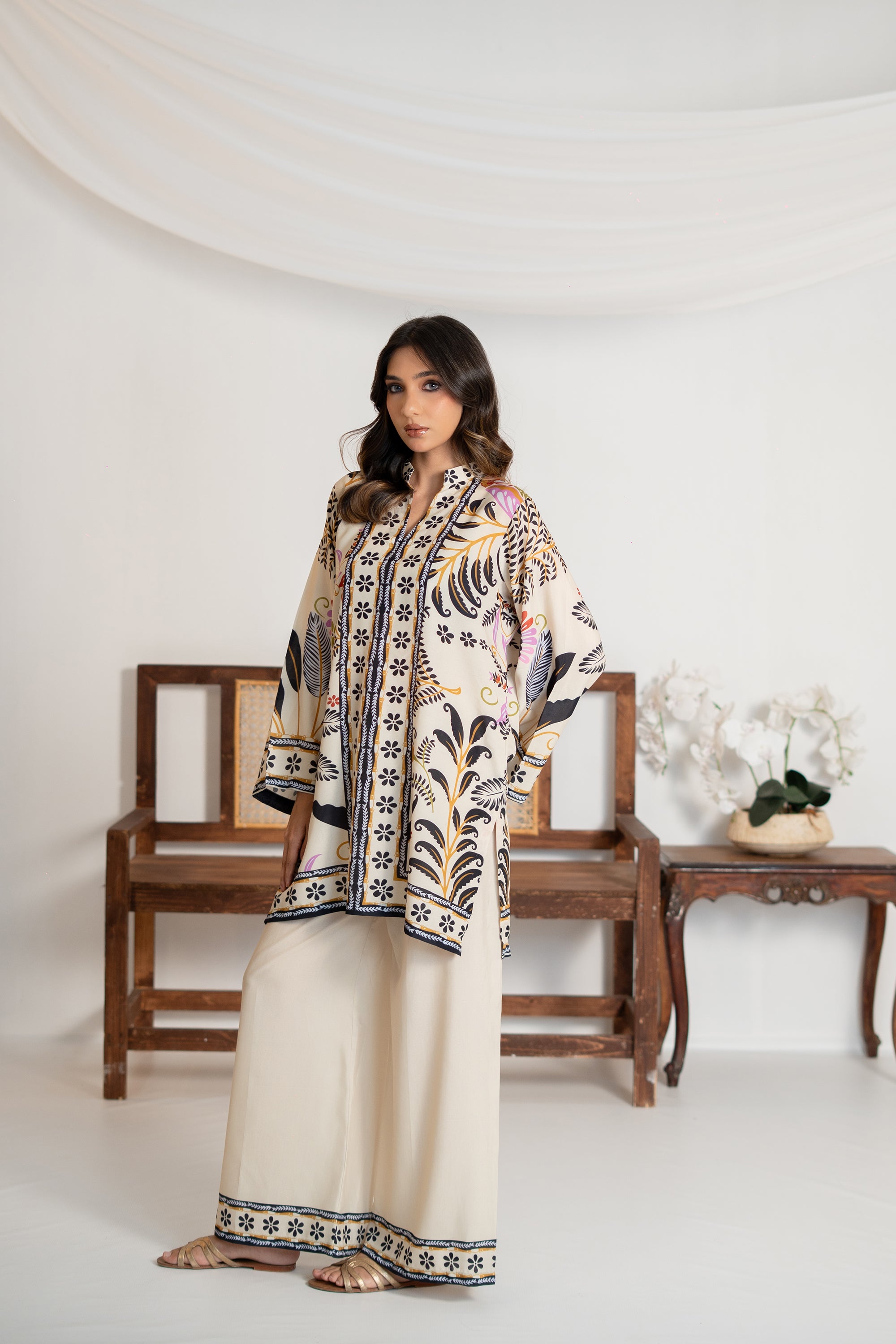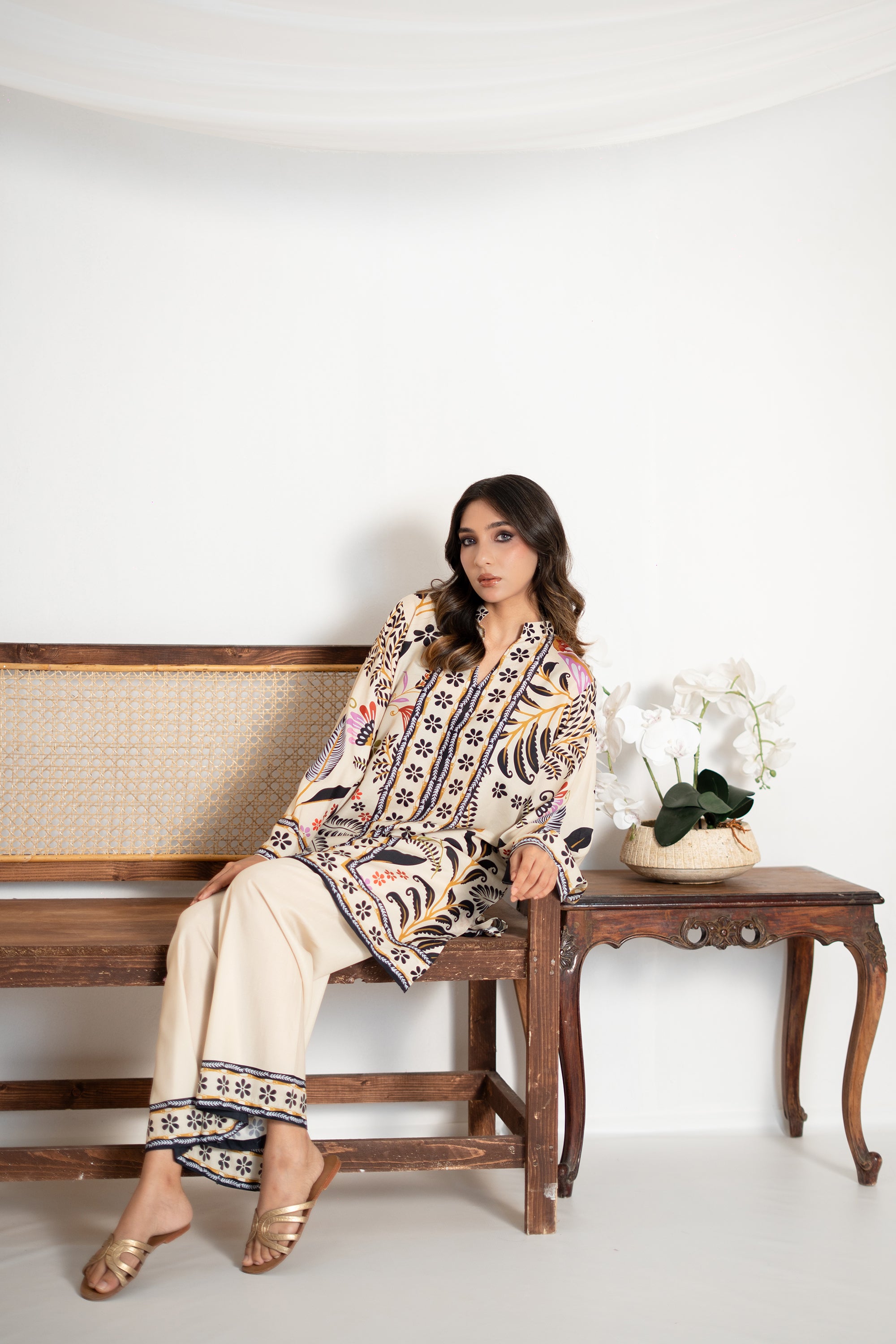 This elegant Printed Swiss Lawn ensemble pairs a flowy, printed kurta with wide-leg trousers for a refined yet relaxed look. The ivory base is adorned with intricate floral and botanical motifs in black, gold, and hints of blush, giving it a timeless charm. The straight kurta features a banded neckline and wide sleeves finished with a patterned border, while the trousers carry matching detailing along the hem for a cohesive touch. Lightweight and breathable, this outfit is perfect for warm days when you want comfort without compromising on style.