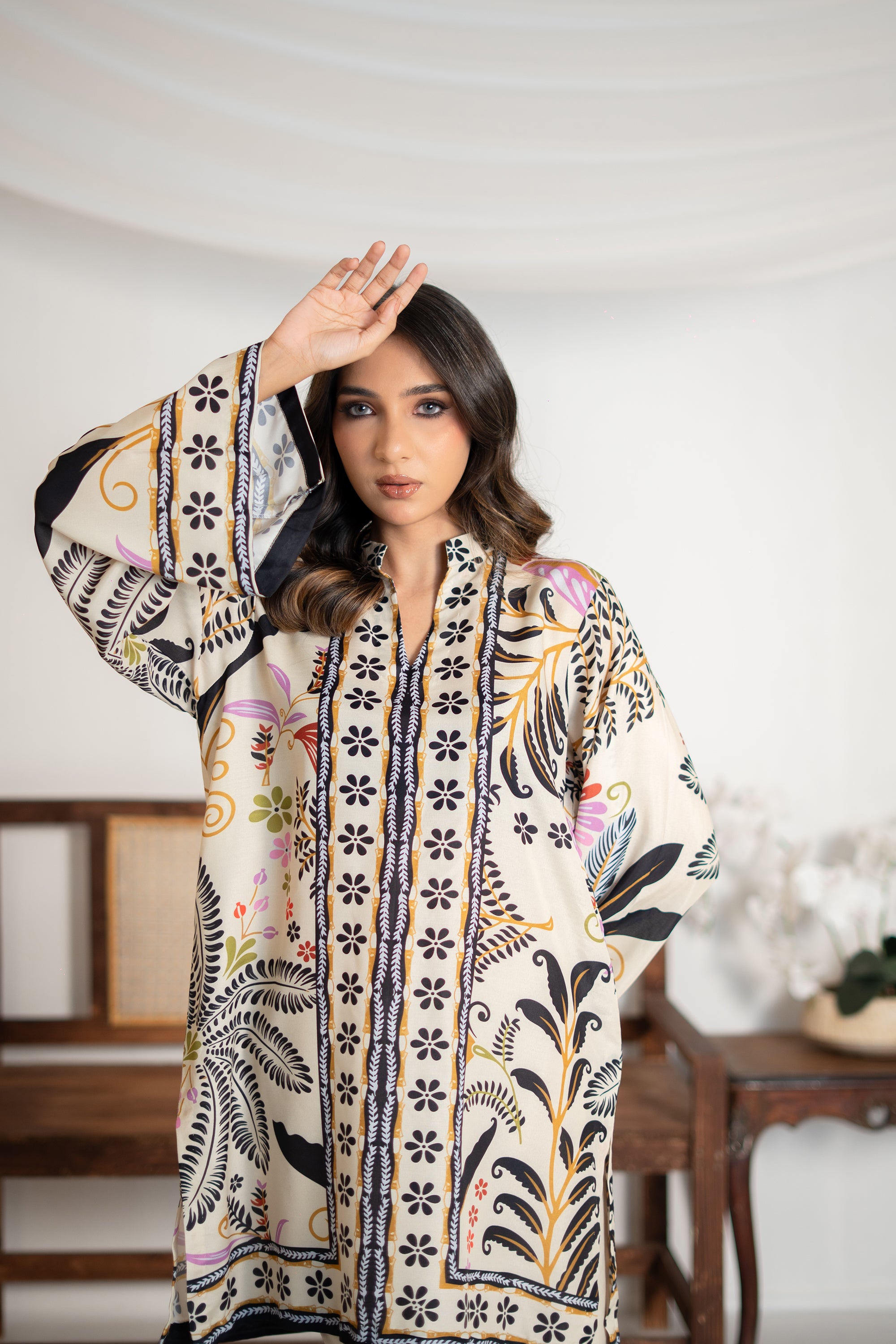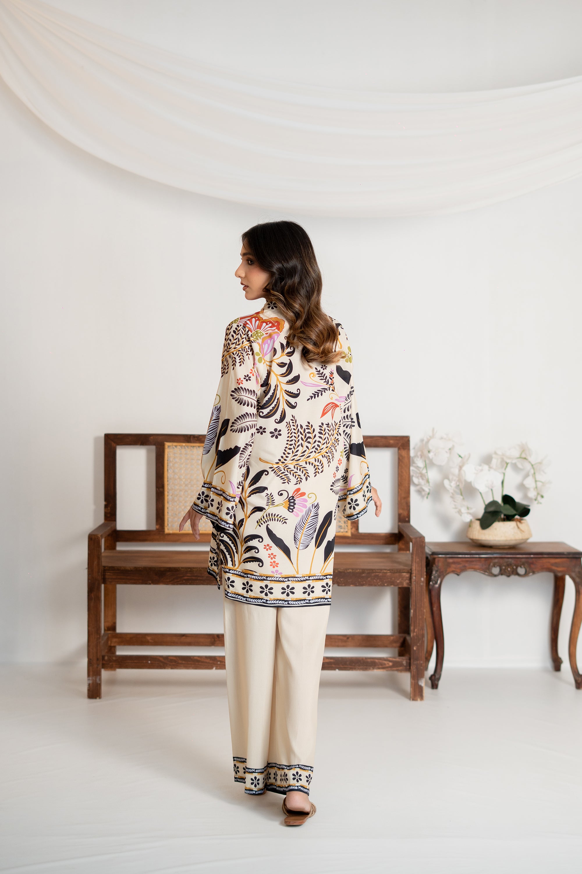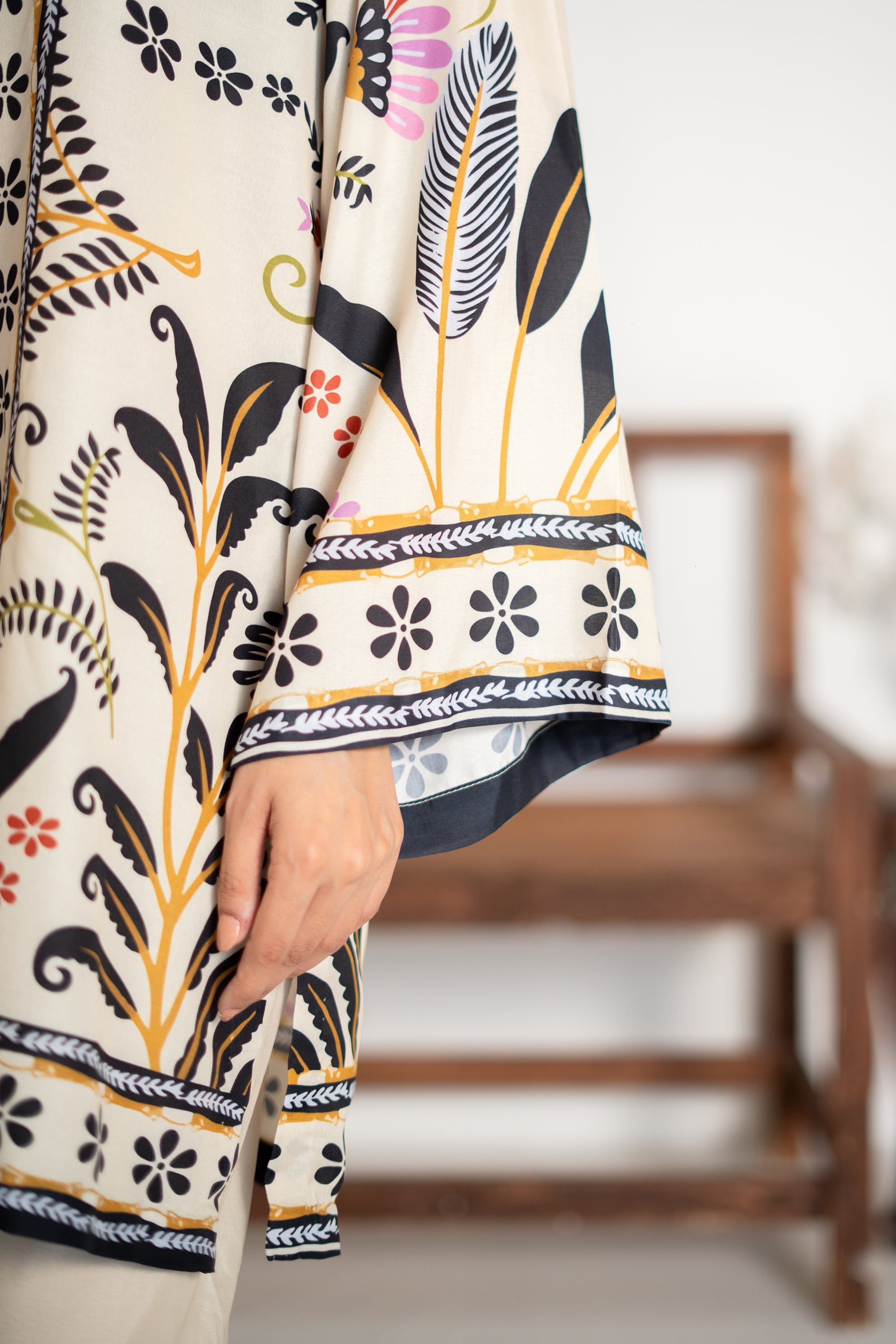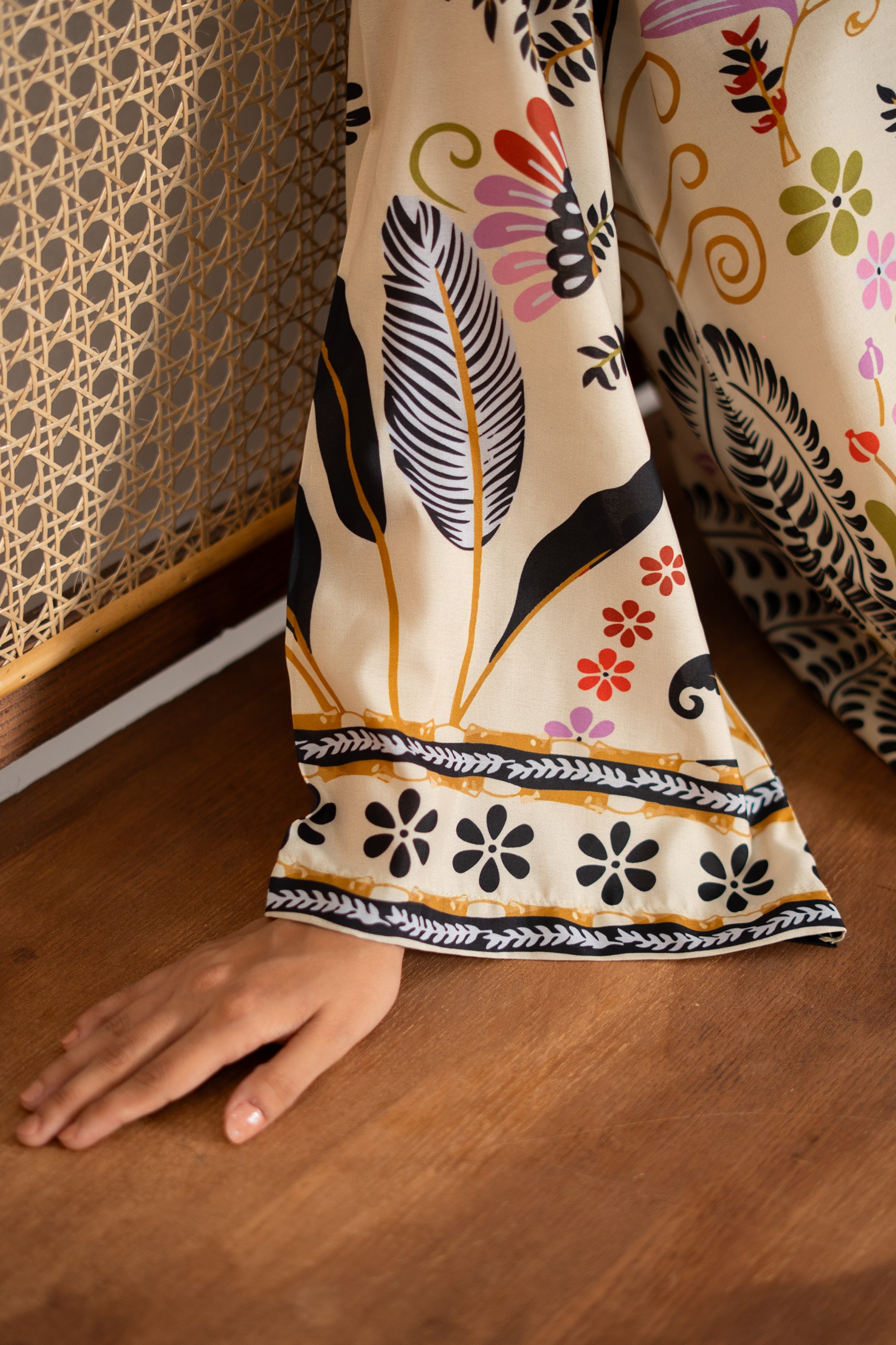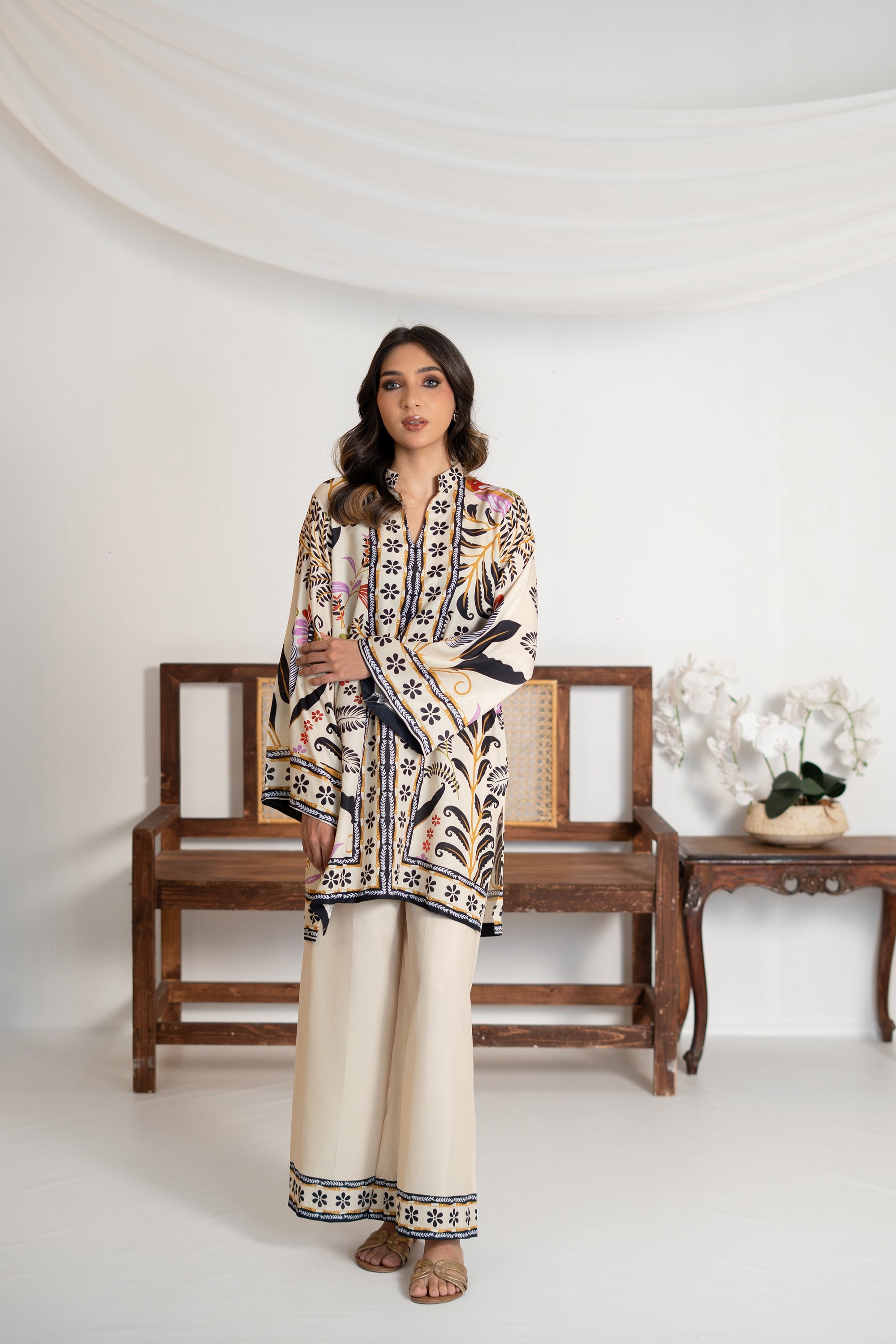 This elegant Printed Swiss Lawn ensemble pairs a flowy, printed kurta with wide-leg trousers for a refined yet relaxed look. The ivory base is adorned with intricate floral and botanical motifs in black, gold, and hints of blush, giving it a timeless charm. The straight kurta features a banded neckline and wide sleeves finished with a patterned border, while the trousers carry matching detailing along the hem for a cohesive touch. Lightweight and breathable, this outfit is perfect for warm days when you want comfort without compromising on style.