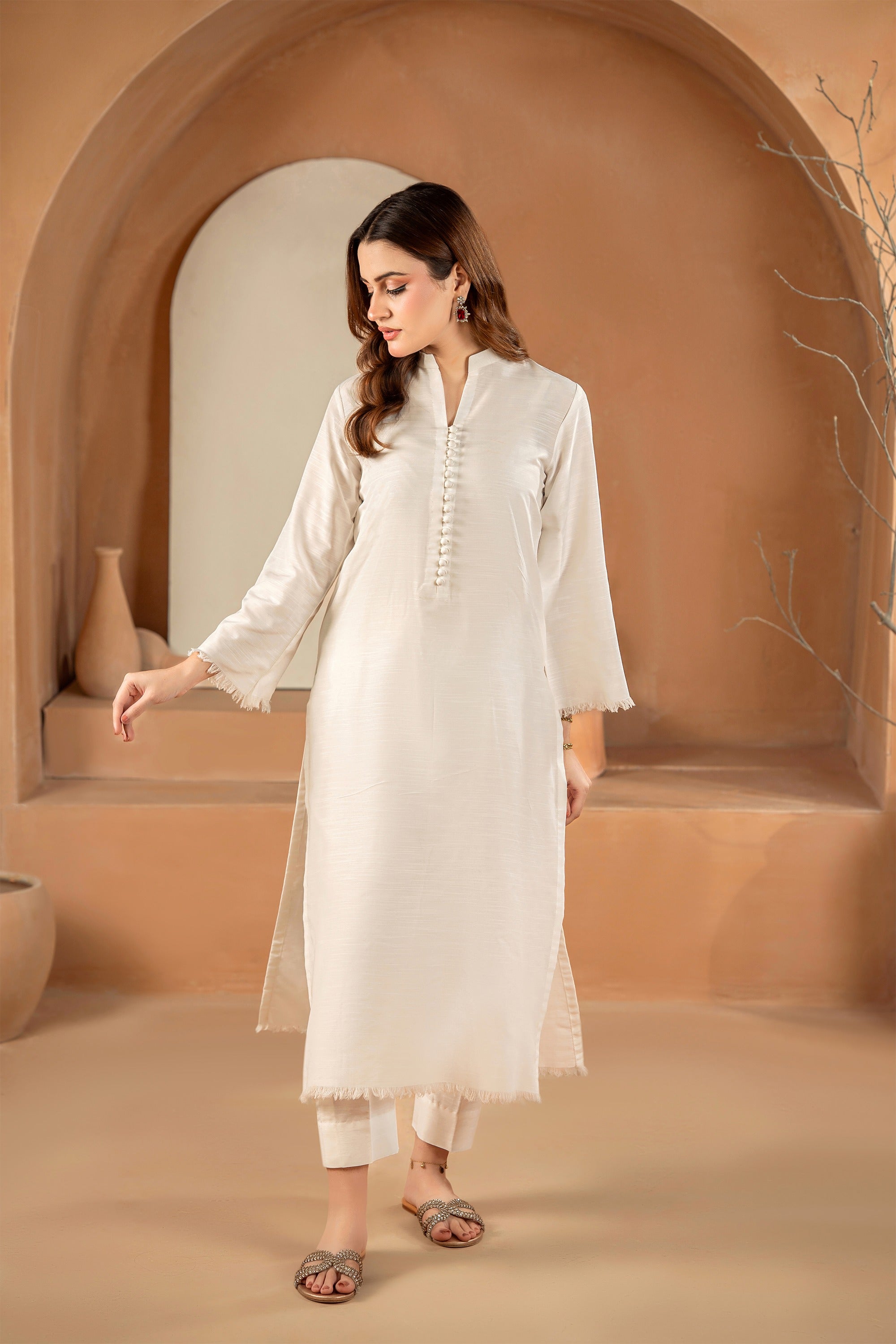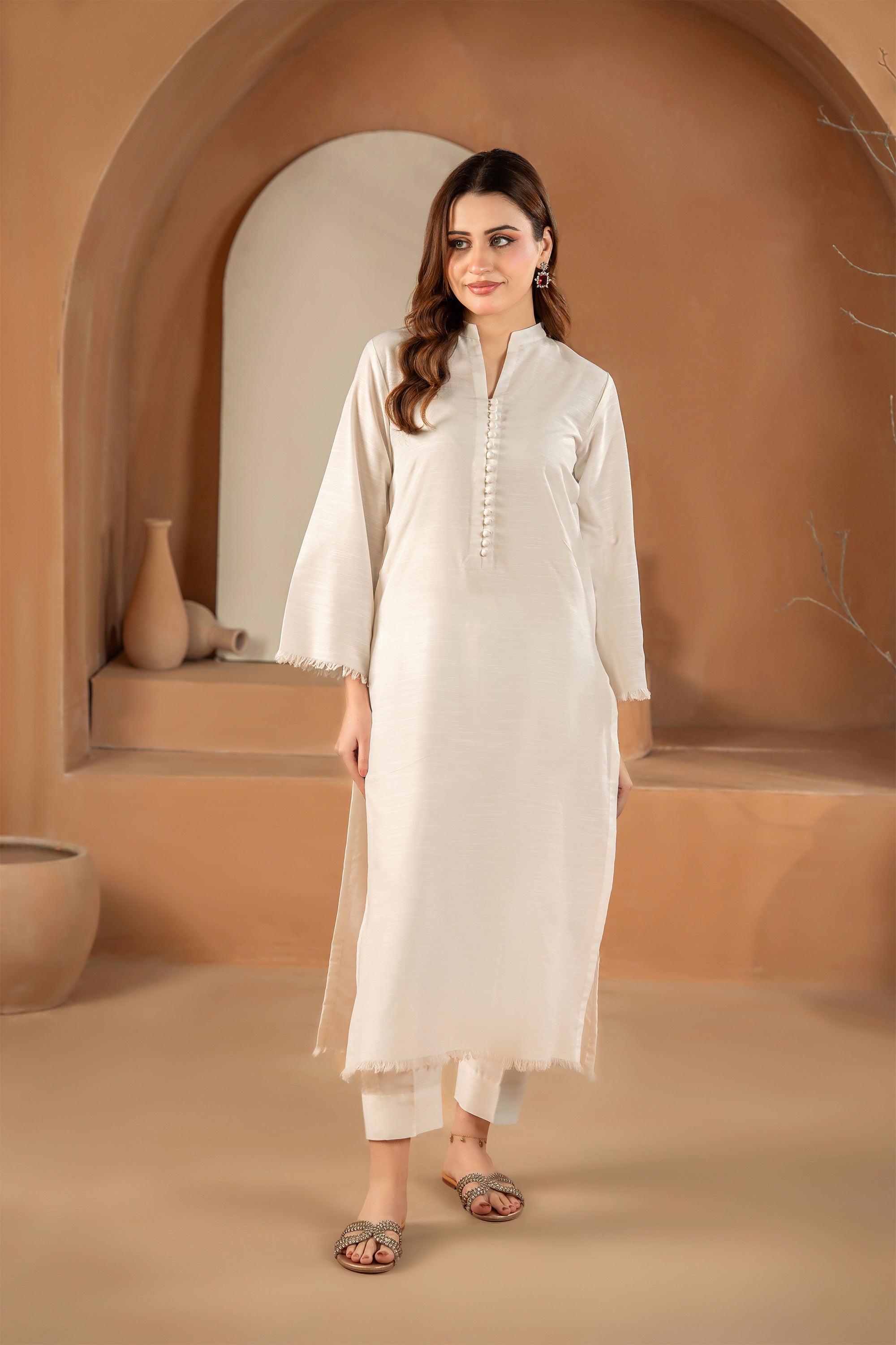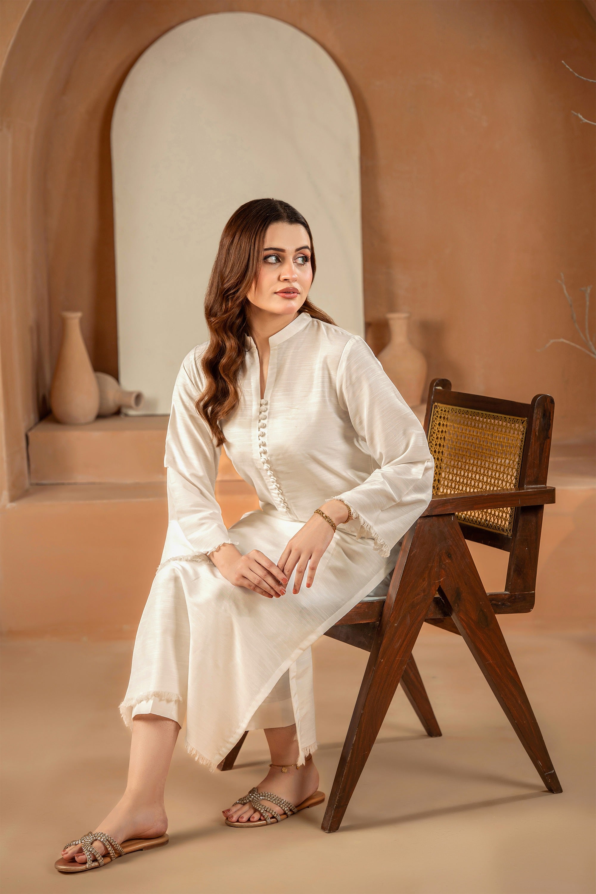 This elegant two-piece set champions minimalist sophistication. Crafted from a textured fabric, the classic straight-cut kurta is enhanced by subtle detailing and clean lines, creating a versatile and graceful look perfect for professional settings, refined daytime events, or polished everyday wear.