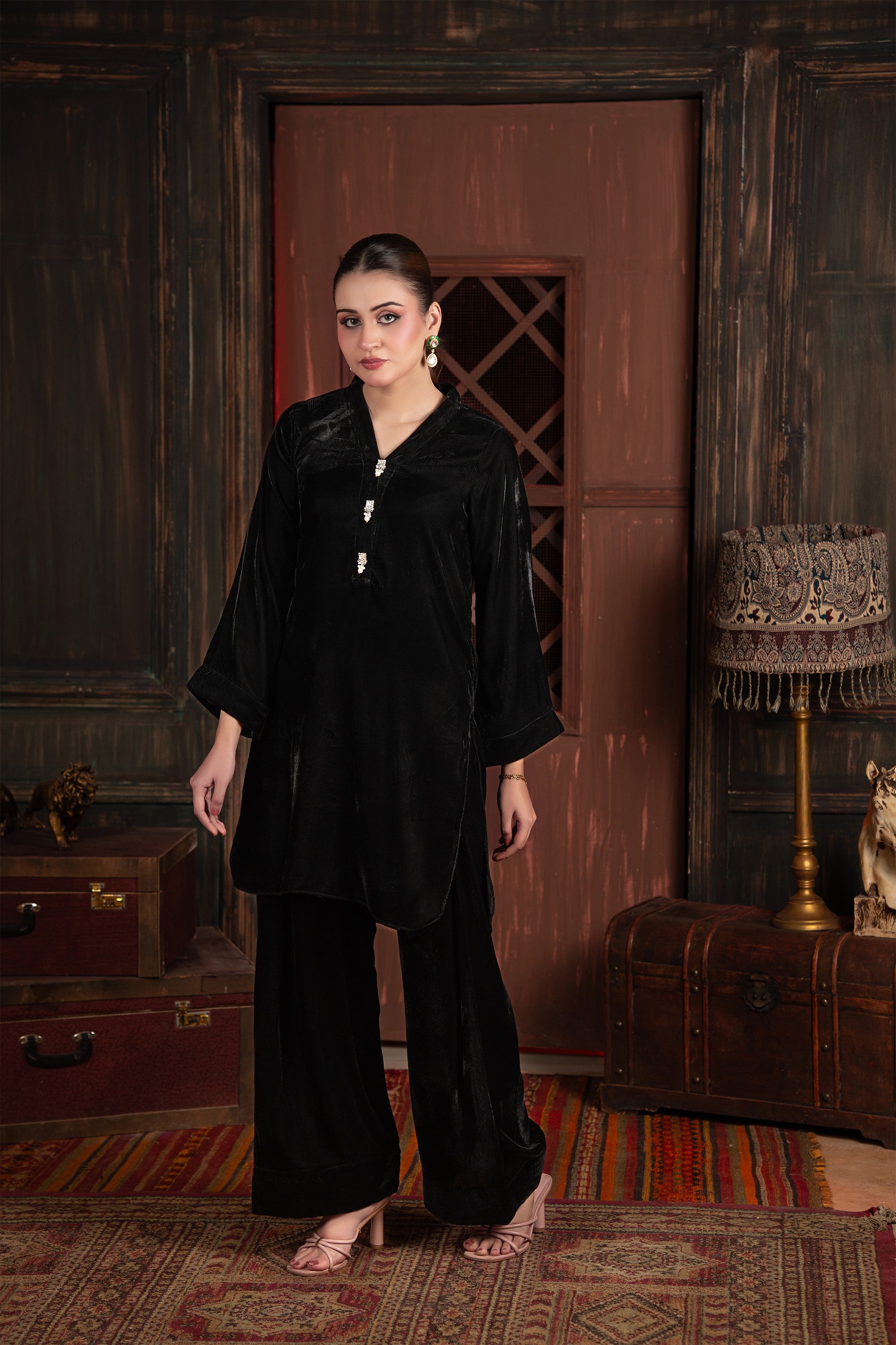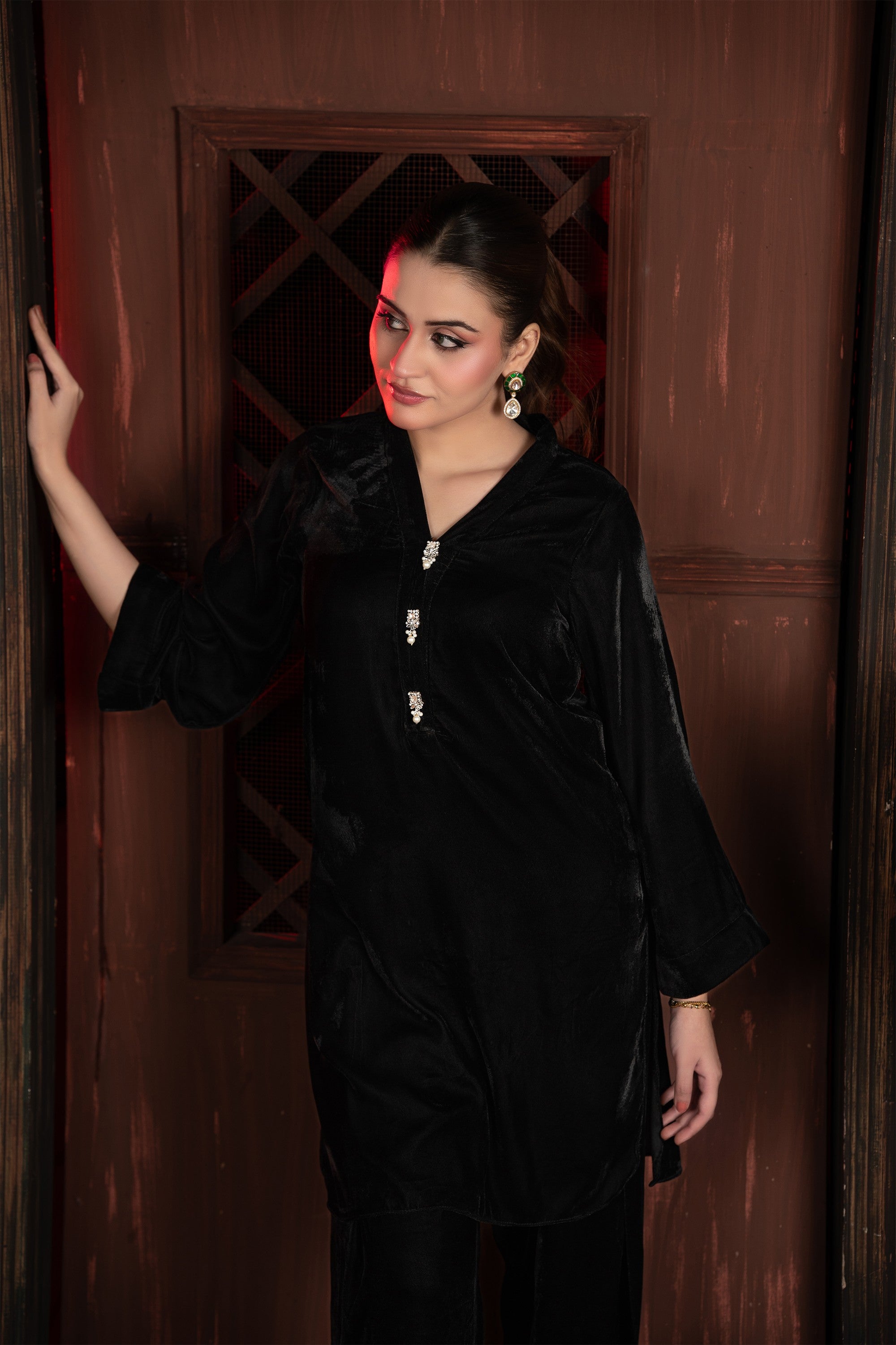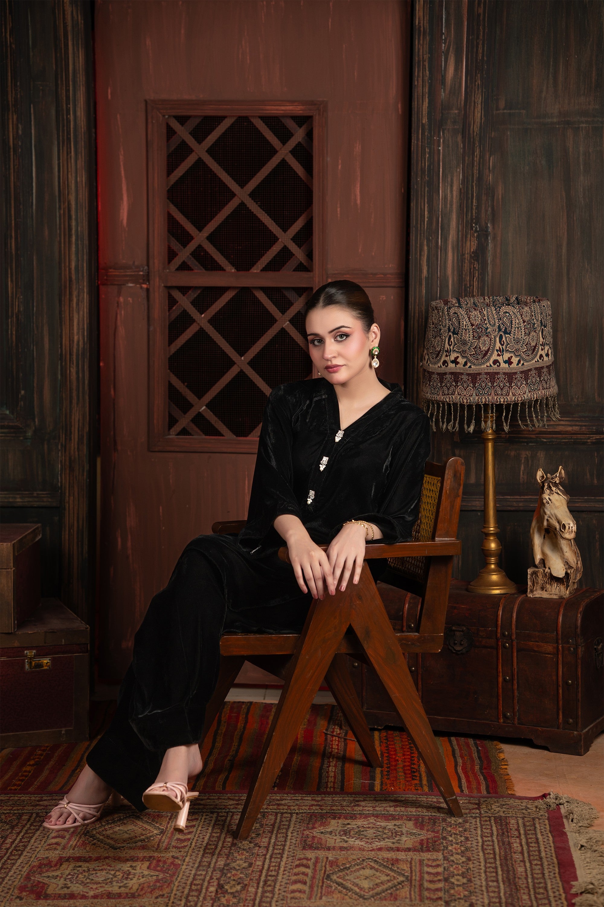Make a bold, luxurious statement with this striking black velvet co-ord set. Designed for ultimate elegance and comfort, the ensemble combines the rich texture of velvet with a stylish silhouette, perfect for making an impact at any winter or semi-formal evening event.