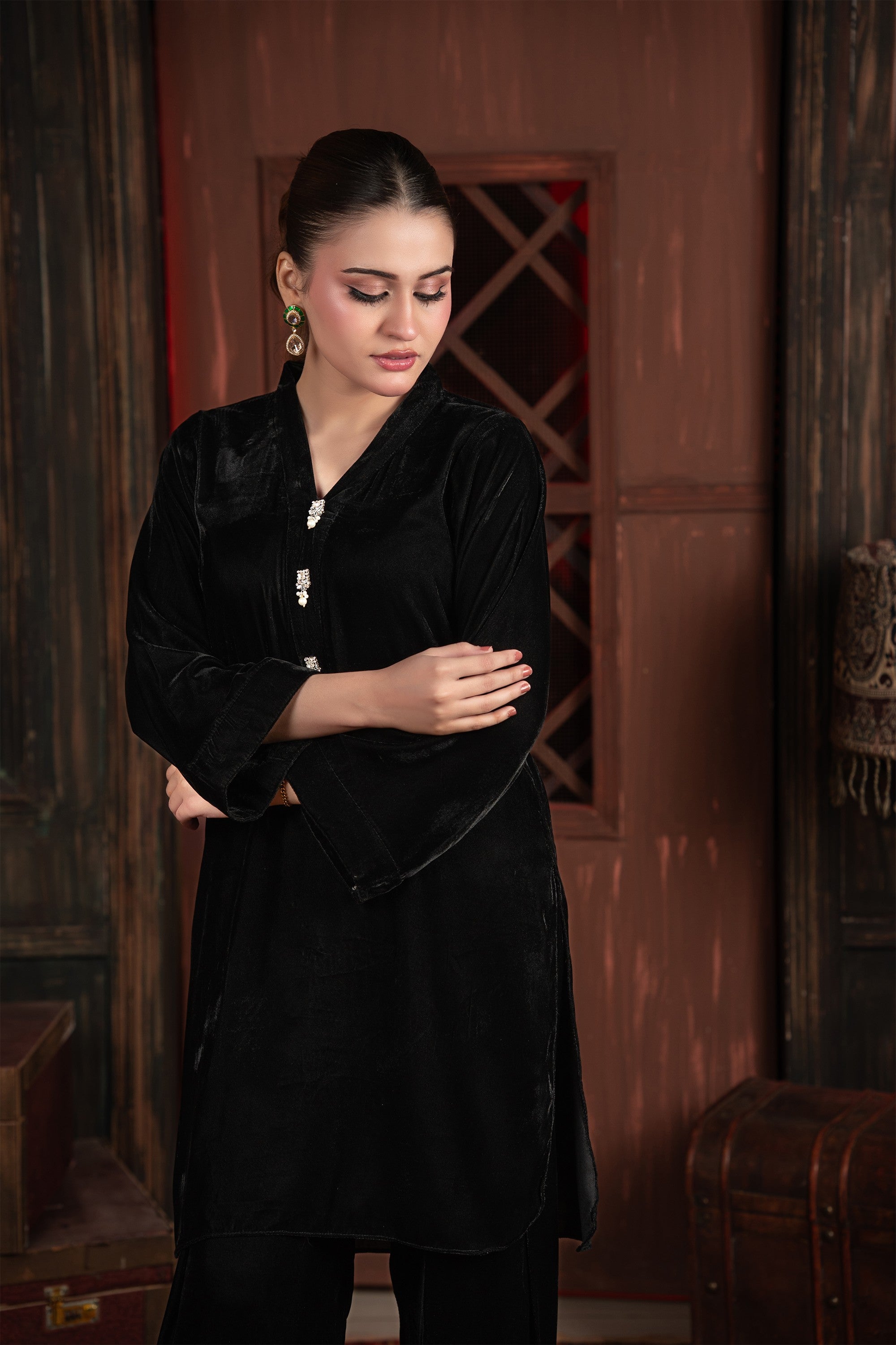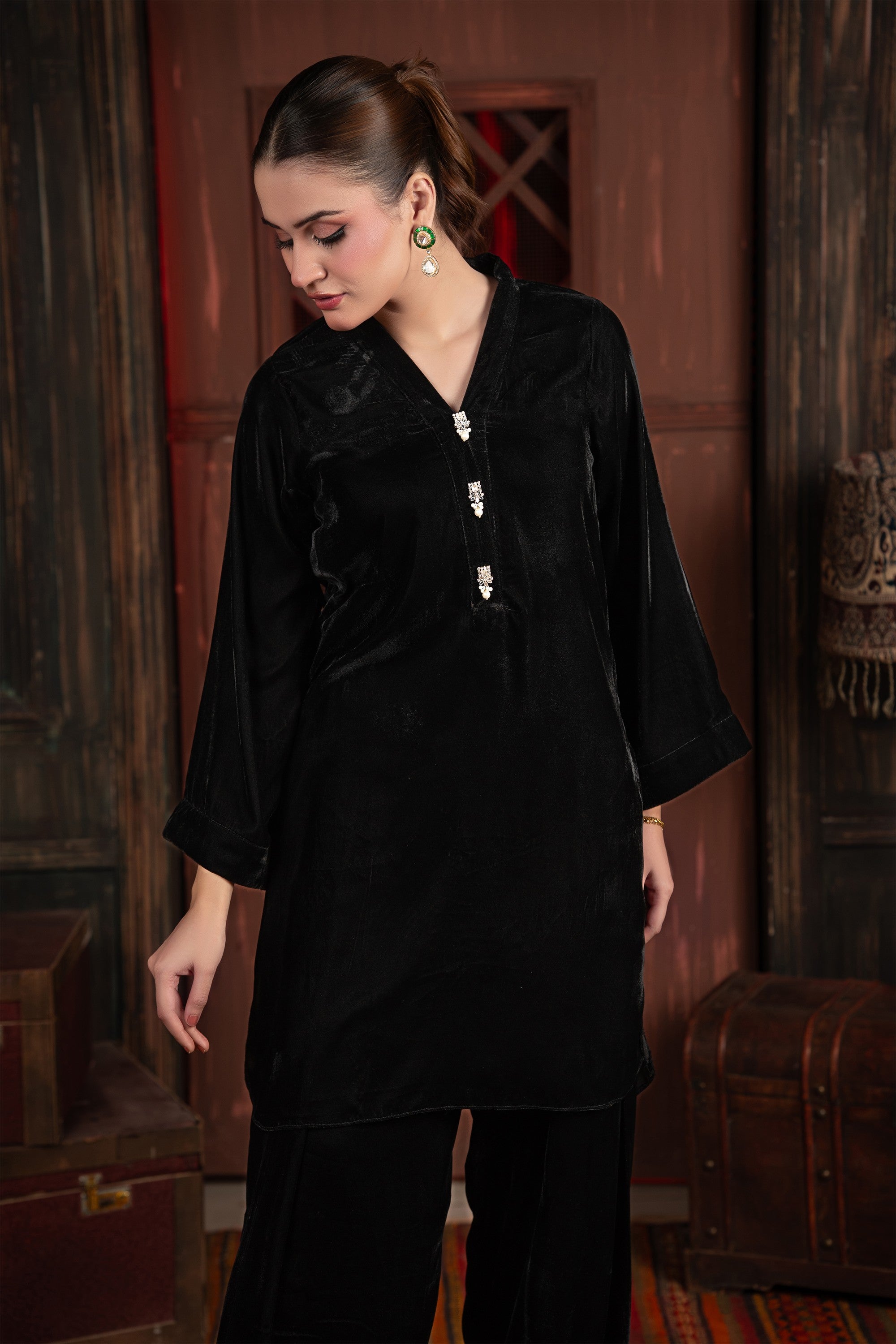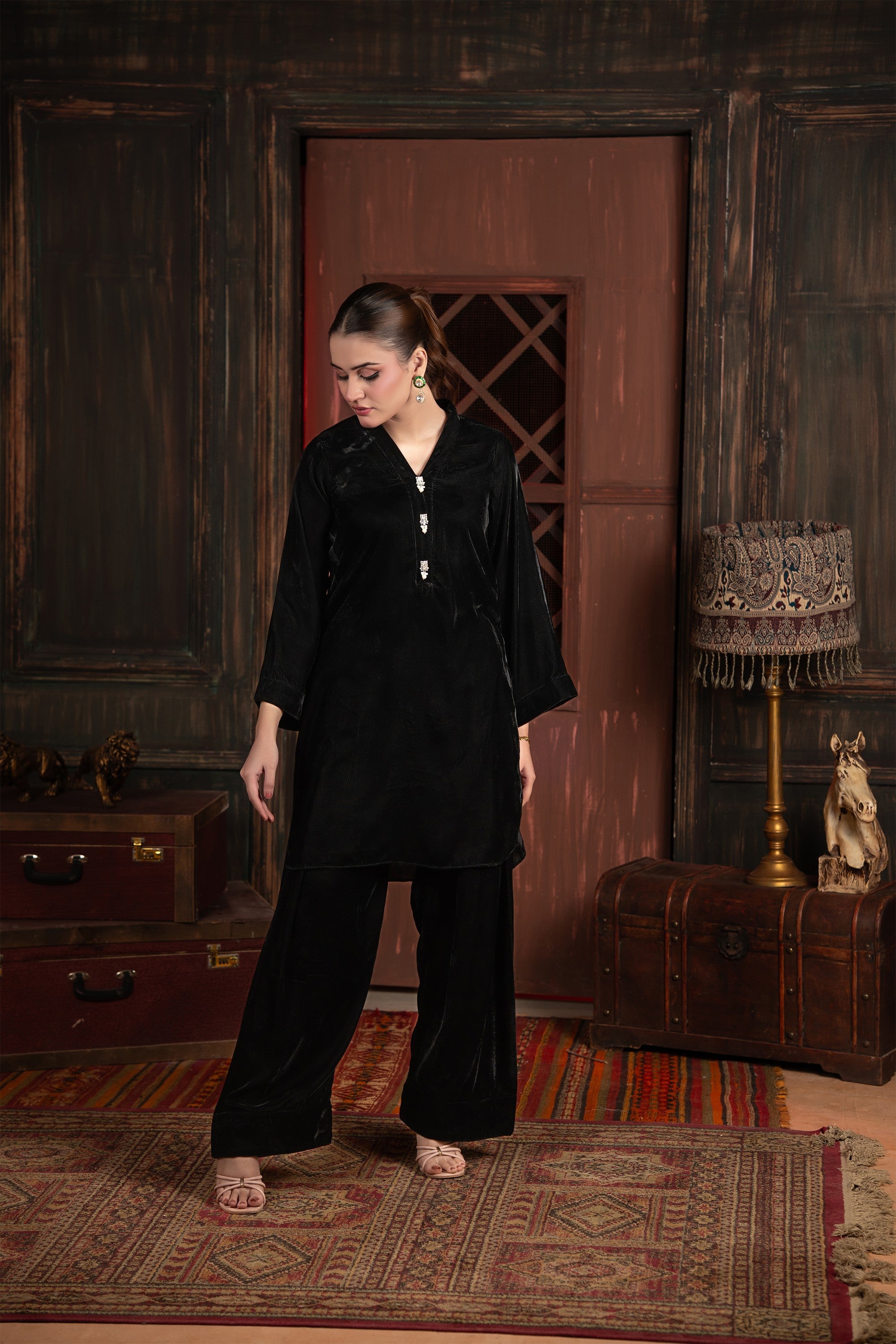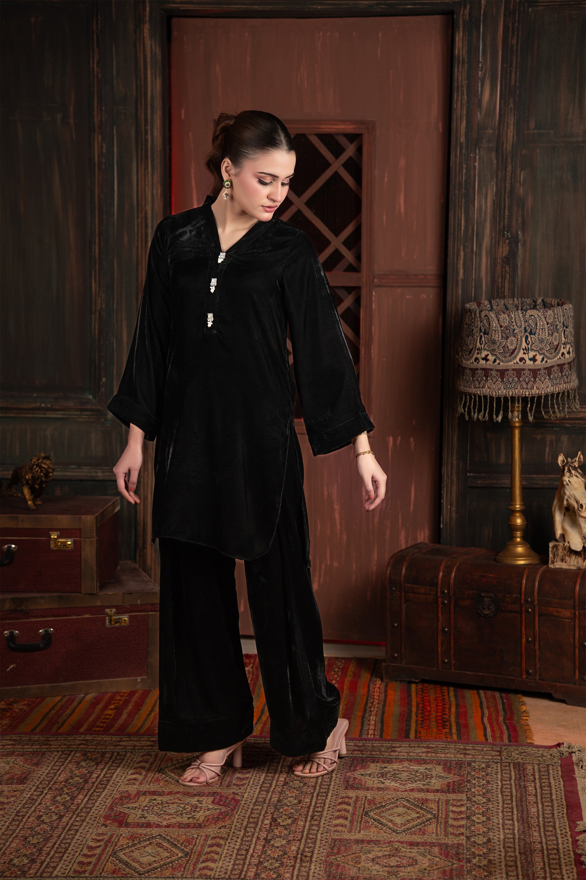 Make a bold, luxurious statement with this striking black velvet co-ord set. Designed for ultimate elegance and comfort, the ensemble combines the rich texture of velvet with a stylish silhouette, perfect for making an impact at any winter or semi-formal evening event.