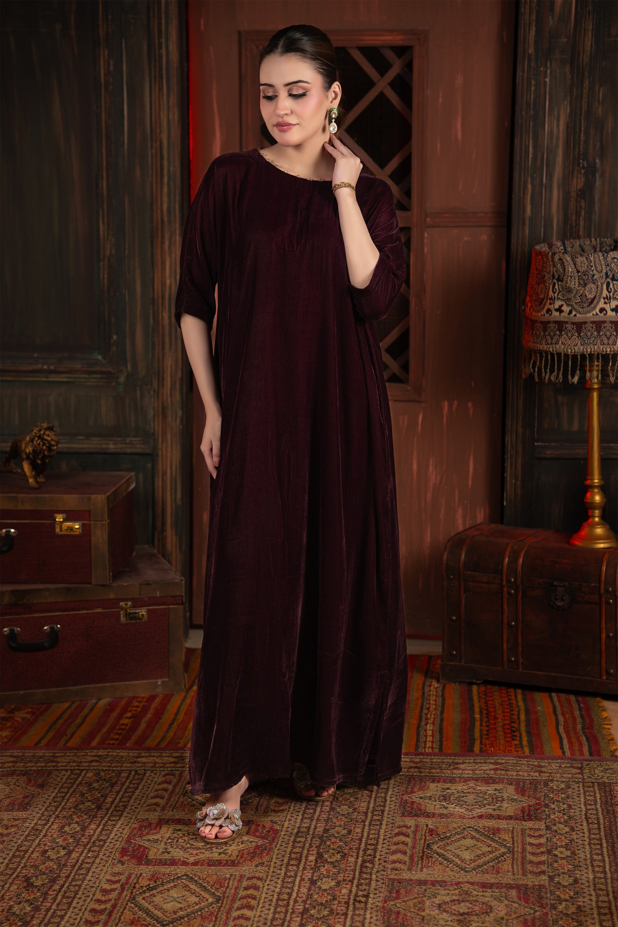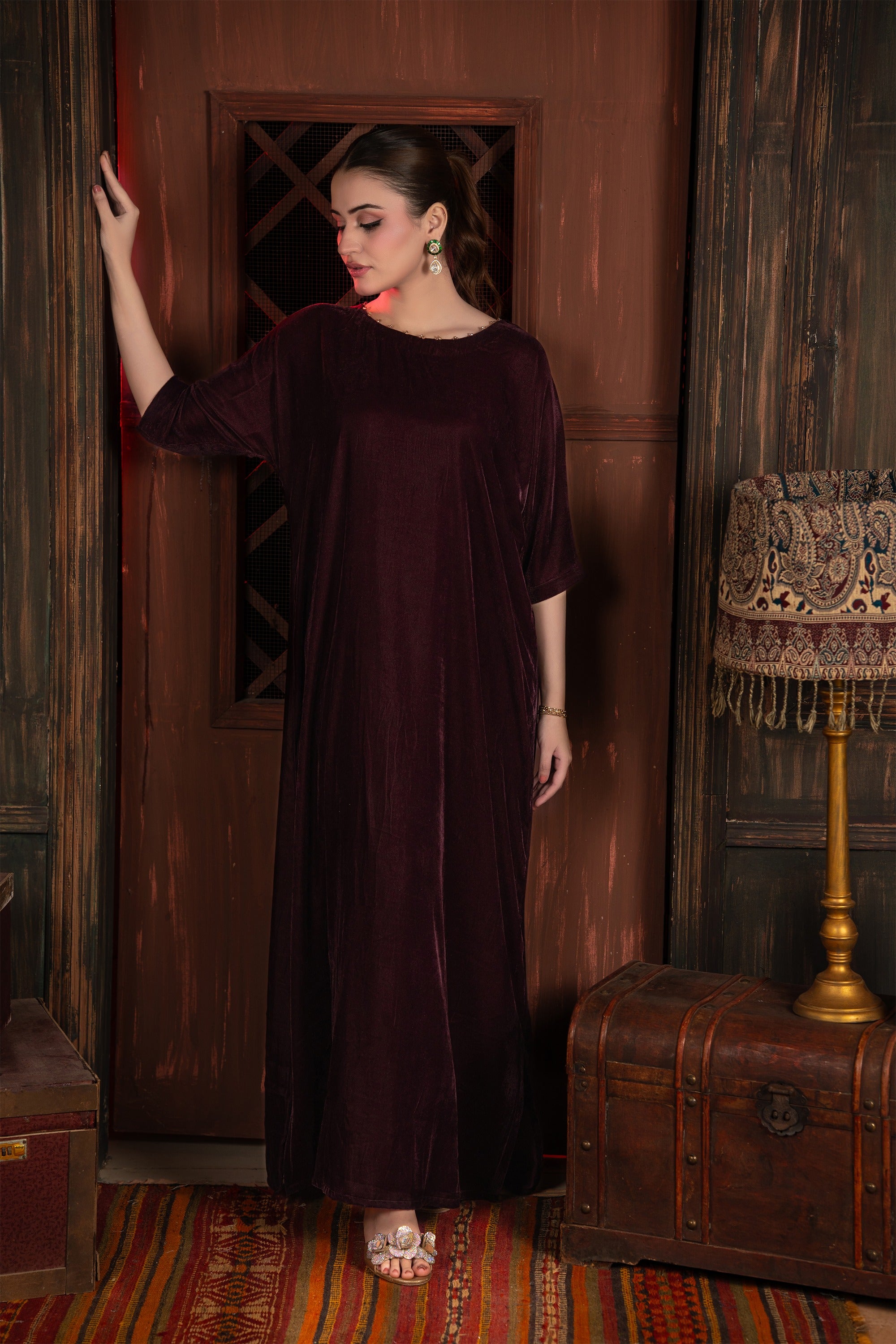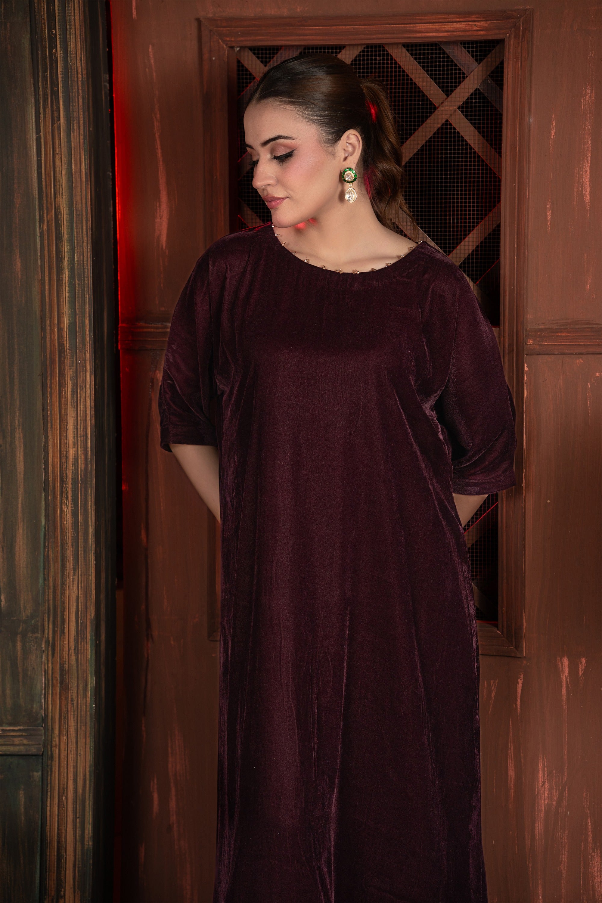 Sworski stones embellishments on neck make it elegant. Indulge in the sumptuous luxury of this beautiful velvet tunic/dress. The rich, deep mulberry color and the decadent texture of the velvet fabric make this an exquisite piece, perfectly suited for elegant winter gatherings, formal dinners, or festive holiday occasion