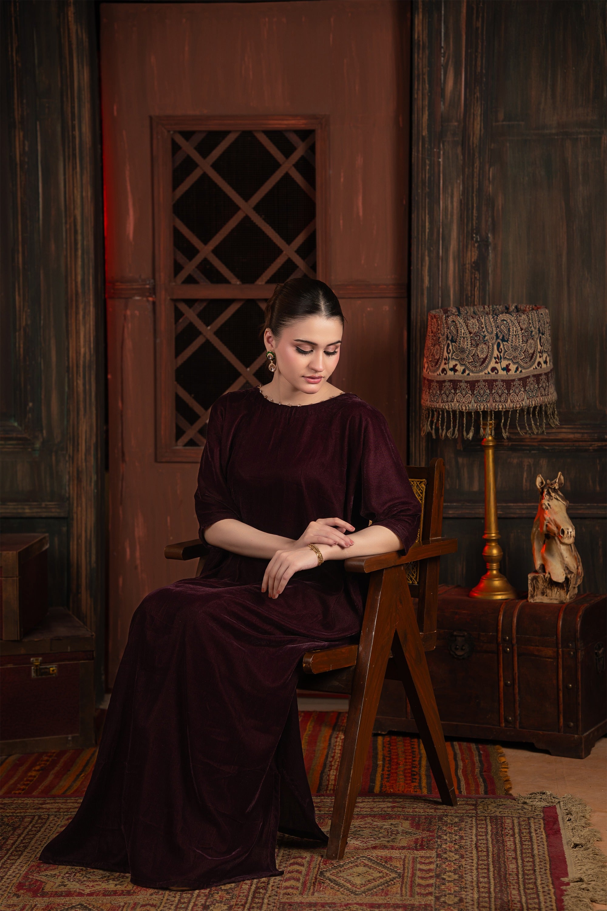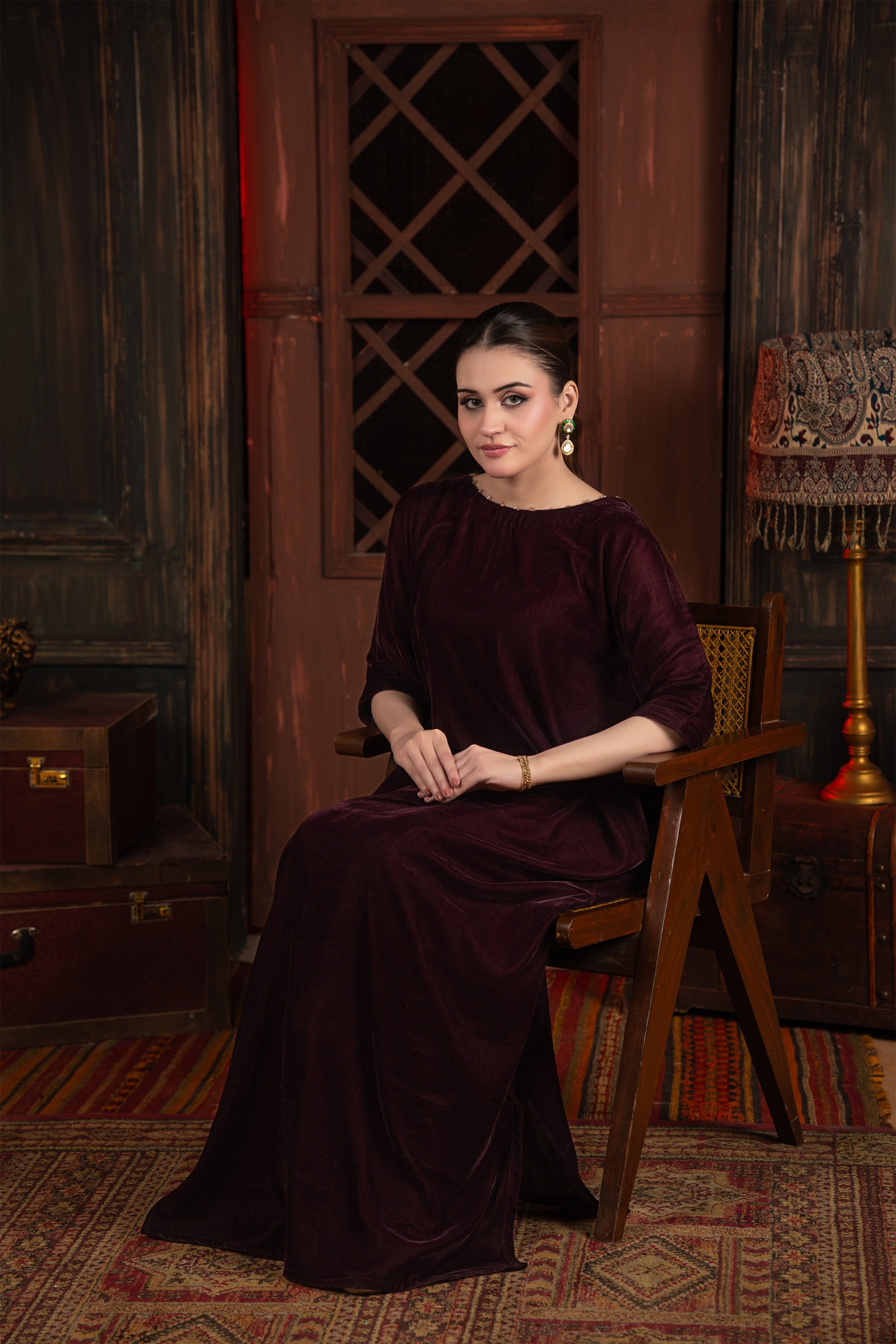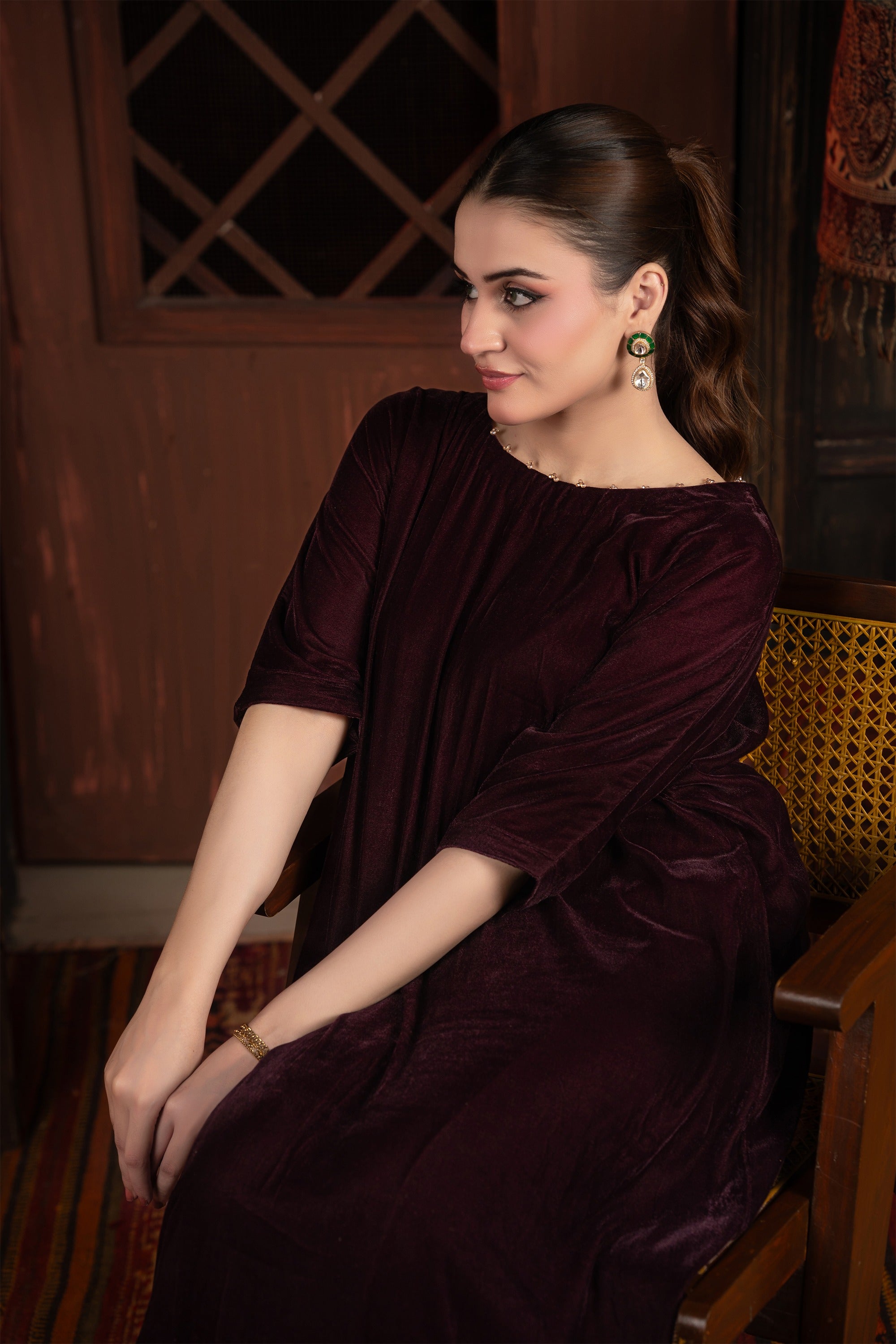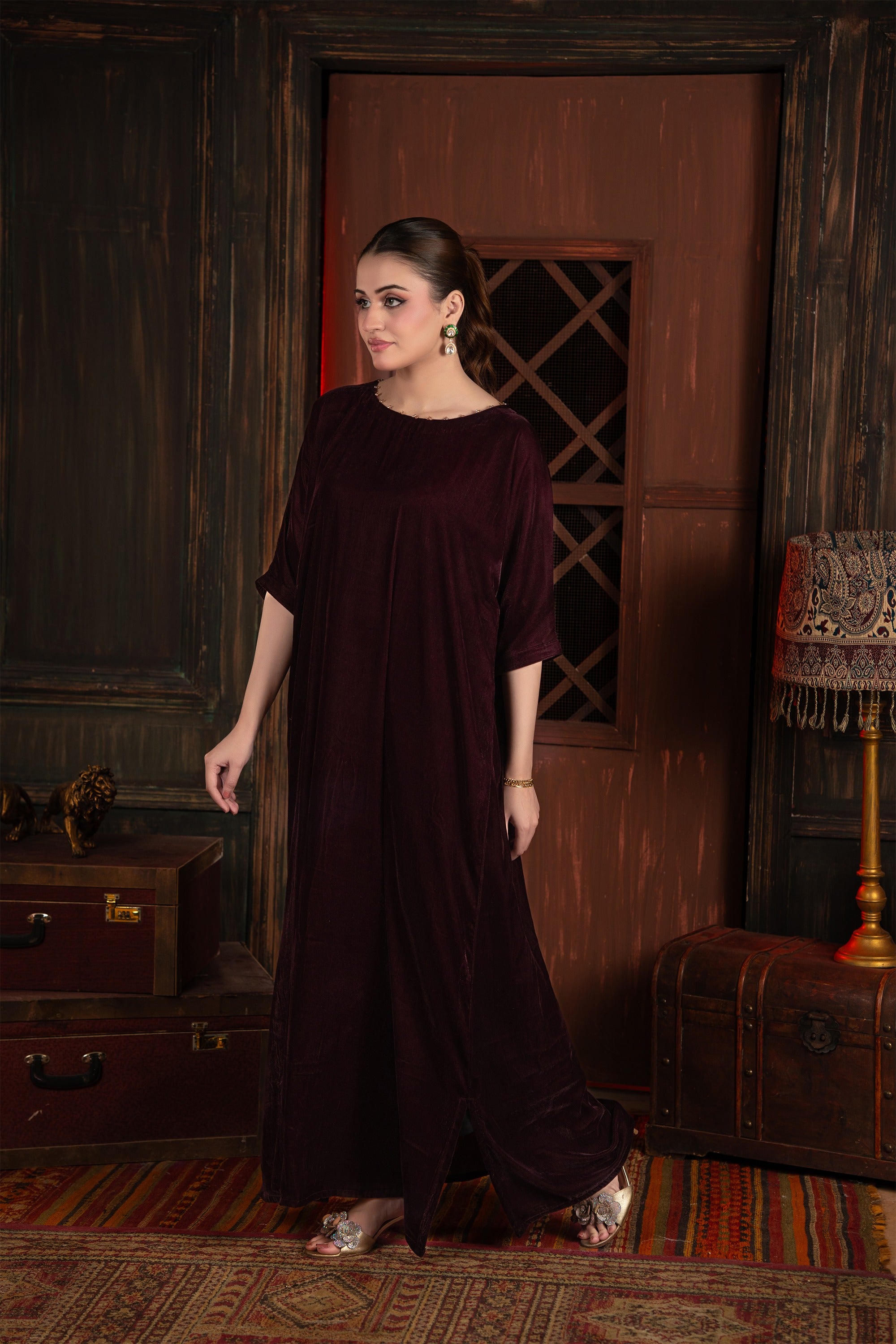 Sworski stones embellishments on neck make it elegant. Indulge in the sumptuous luxury of this beautiful velvet tunic/dress. The rich, deep mulberry color and the decadent texture of the velvet fabric make this an exquisite piece, perfectly suited for elegant winter gatherings, formal dinners, or festive holiday occasion